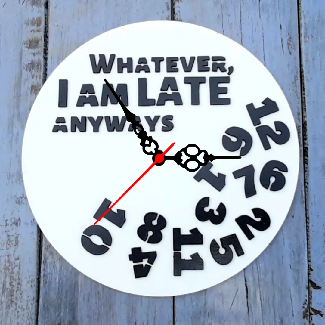 “I Am Late” Laser-Cut Theme Clock (White): Unique 30cm Diameter Timepiece with Easy Mounting