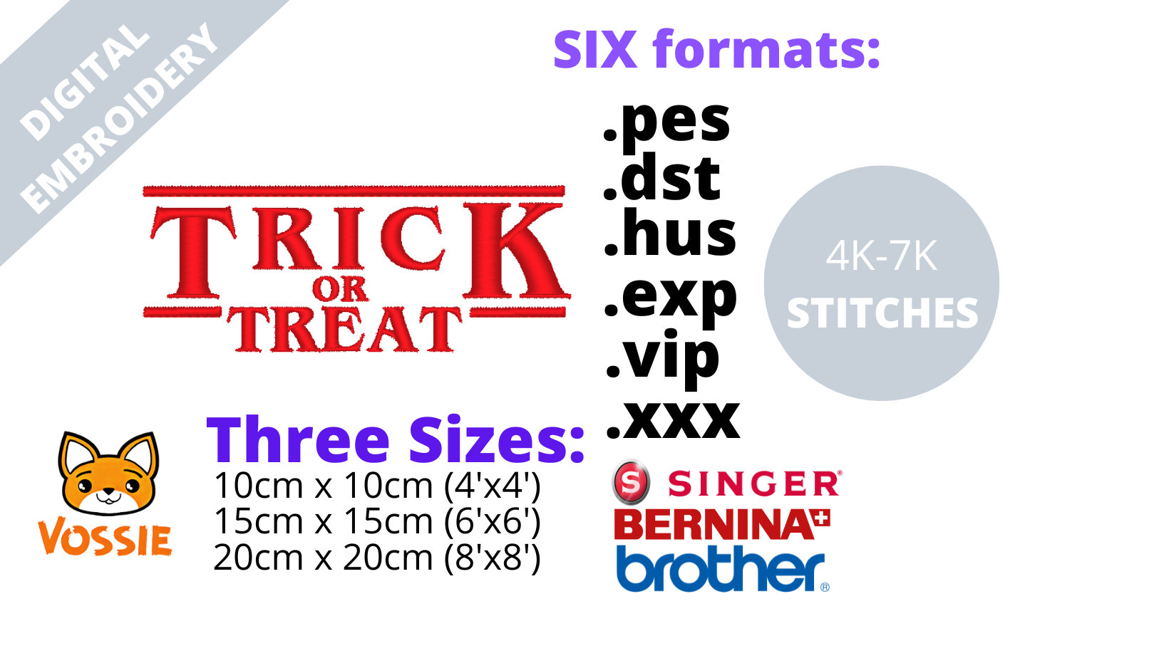 The Trick-or-Treat Halloween Digital Embroidery Design is a premium digital product that can be downloaded immediately after purchase. This collection includes more than 6 unique patch designs in .pes .dst .hus .exp .vip .xxx format, specifically created for embroidery machines.